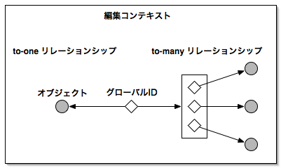 オブジェクトは、IDとセットで管理されます。 このIDはグローバルIDと呼ばれ、メモリ上のオブジェクトを表すオブジェクトIDではありません。 to-oneリレーションシップを持つオブジェクトはグローバルIDと1対1で管理されますが、 to-manyリレーションシップはグローバルID同士で管理されます。