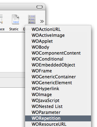 まずはMain.woを開き、先程配置したエレメントを消してください。次にツールバーの「Dynamic」からWORepetitionを選択、配置します(図4.3.3.1[WORepetitionの配置]、図4.3.3.2[WORepetition])。